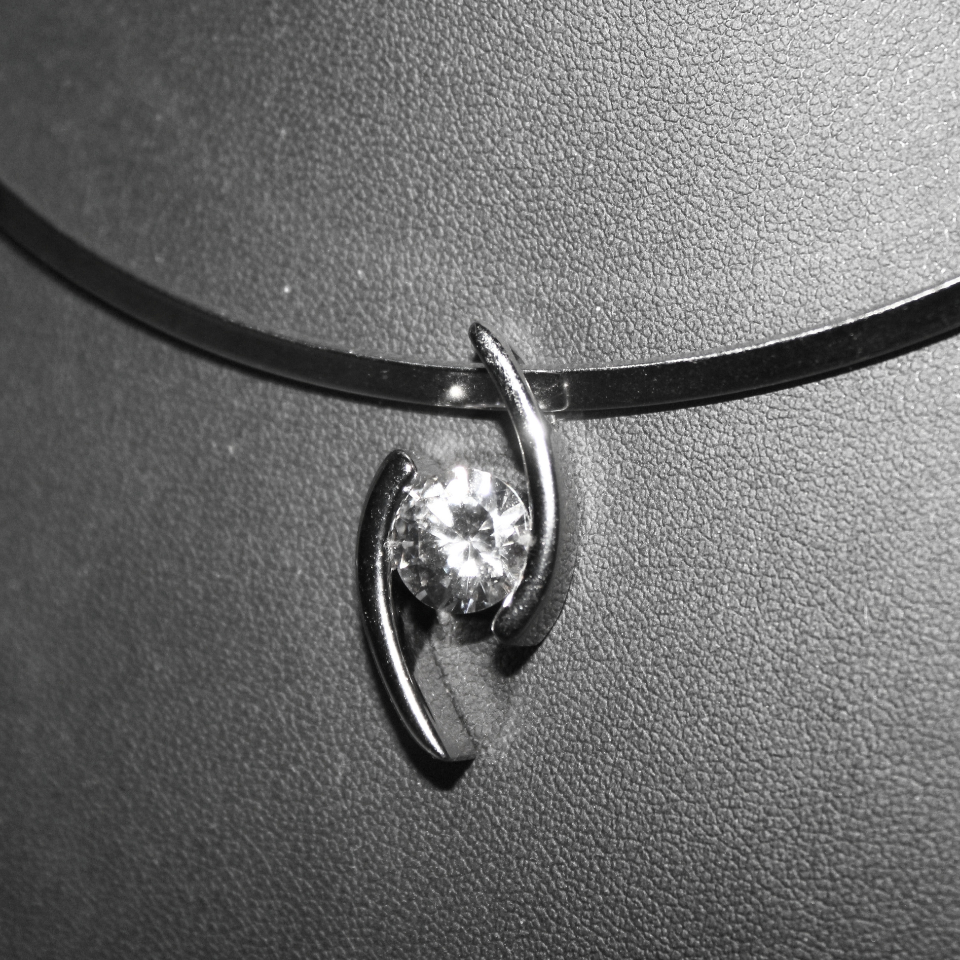 This gorgeous silver flex bar choker necklace features a stunning abstract CZ pendant. The pendant is removable and the choker bar is flexible for ease wear.