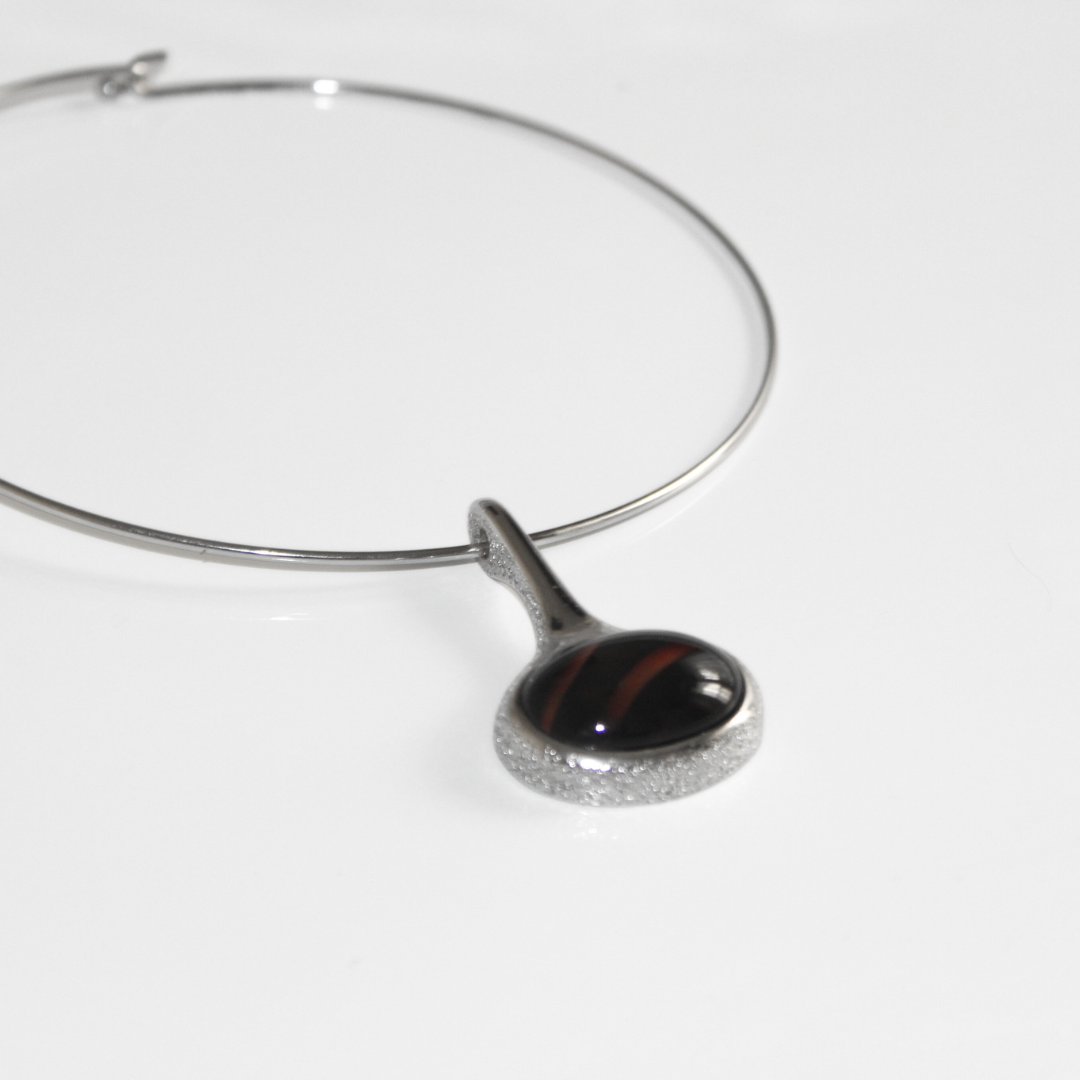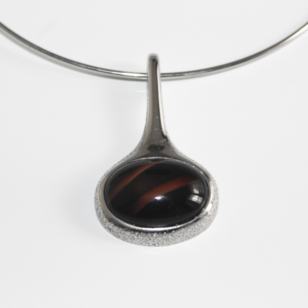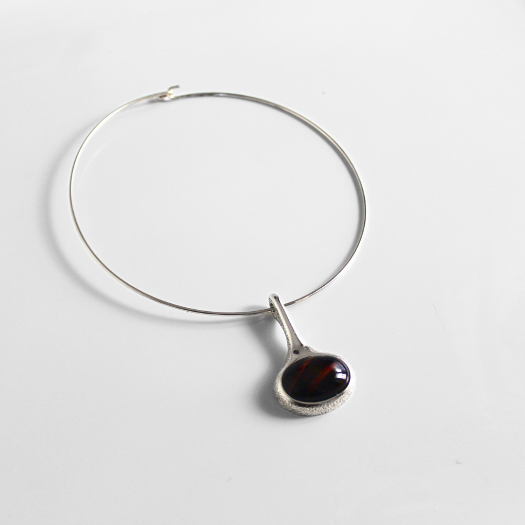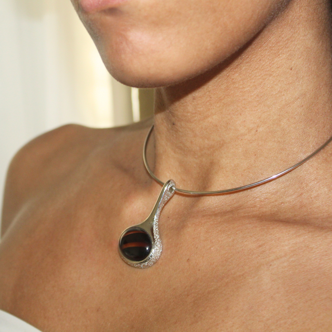 A striking mid-century modern design, this vintage Sarah Coventry choker is the perfect balance of sleek minimalism and bold statement. The necklace features a polished silver-tone wire collar that sits elegantly at the neckline, finished with a sculptural teardrop slider pendant. At its center, a domed striped cabochon in rich brown tones adds depth and drama.
