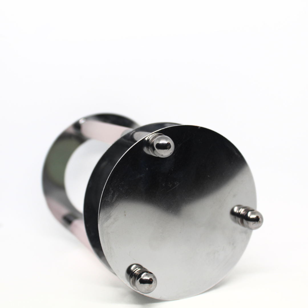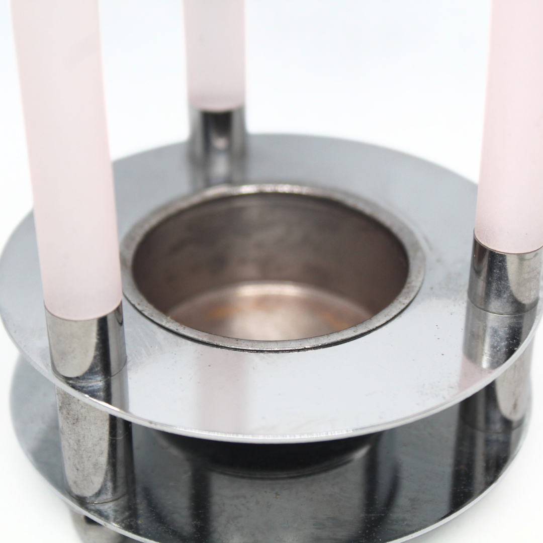 A striking blend of softness and structure, this vintage tea light holder is a modernist statement piece. Designed with three frosted pink lucite columns anchored by polished chrome discs, it balances geometric precision with a touch of playful color. Chrome ball finials complete the design, giving it a sculptural, almost architectural presence.